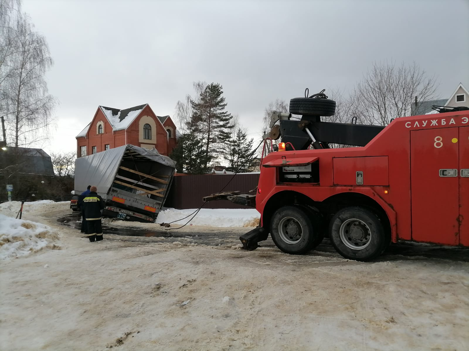 Водитель грузовой машины, двигаясь по навигатору, въехал в забор частного дома. Работали быстро и максимально аккуратно, чтобы не навредить забору еще больше.